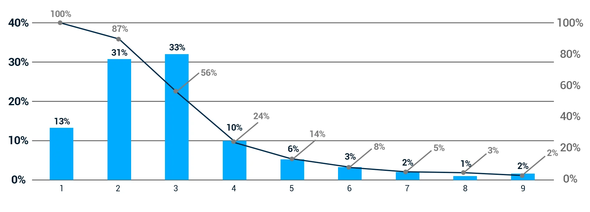 However, usage is not widespread across functions. 44% of all respondents that use generative AI use it in more than three areas, after which the usage rate drops steeply.