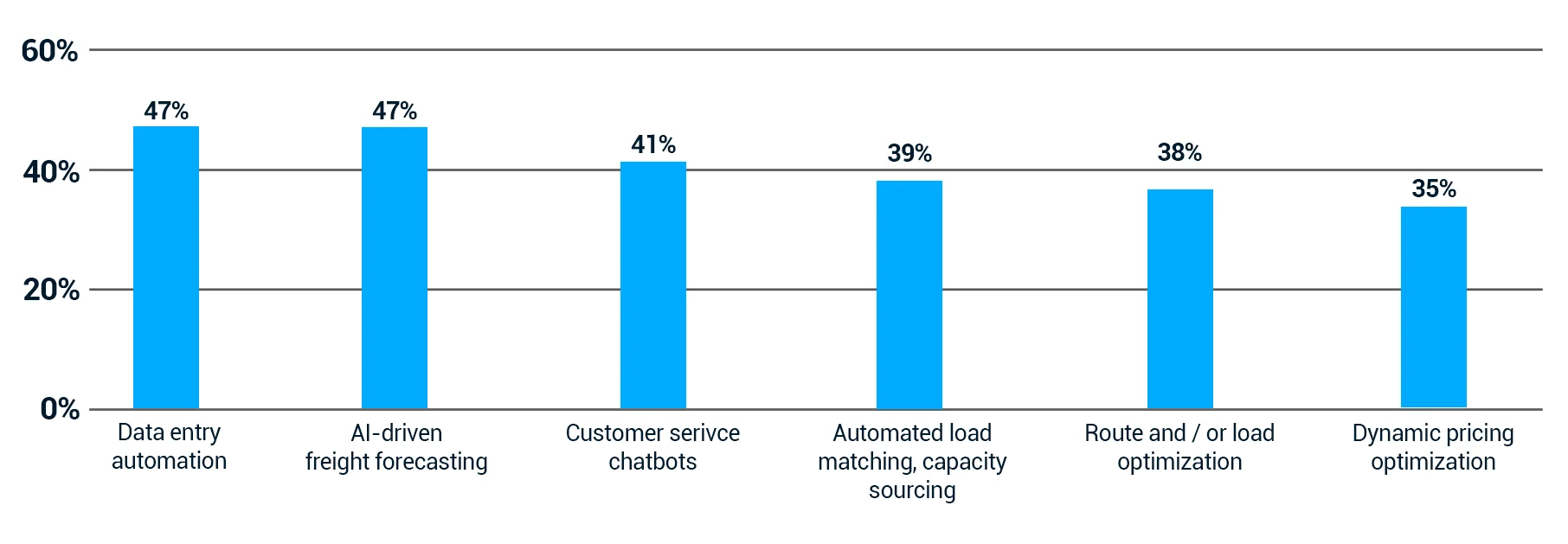 Generative AI is widespread but utilization is shallow. An overwhelming 97% of NA shipper respondents are using generative AI in some transportation function, with top use cases in data entry (47%), freight forecasting (47%), and customer service chatbots (41%) rounding out the top three categories.